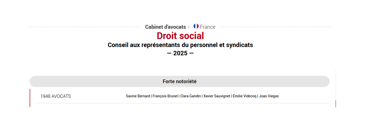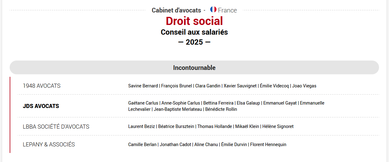 Classement Décideurs des cabinets d'avocats en Droit social Conseil aux représentants du personnel et syndicats 2025